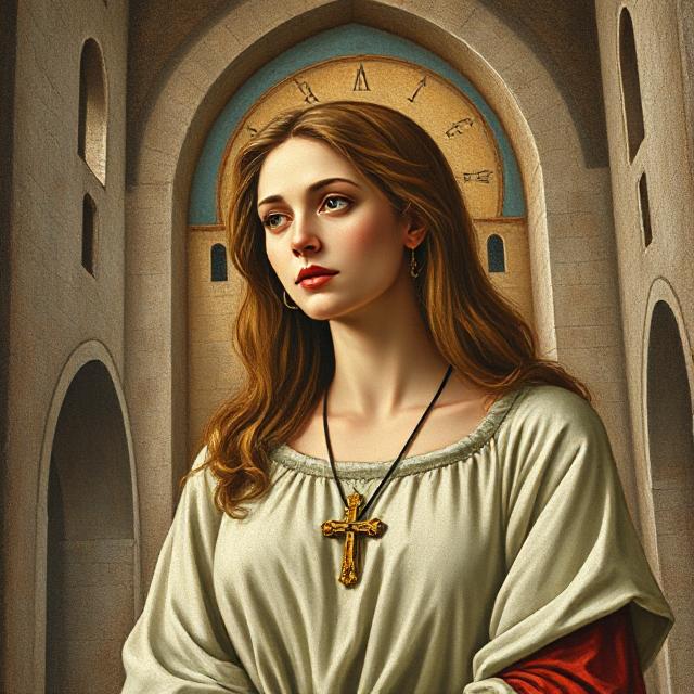 Une jeune femme entre. Elle porte une robe simple, une croix en bois autour du cou. Ses cheveux sont bruns, attachés. Son regard est calme, mais ferme.